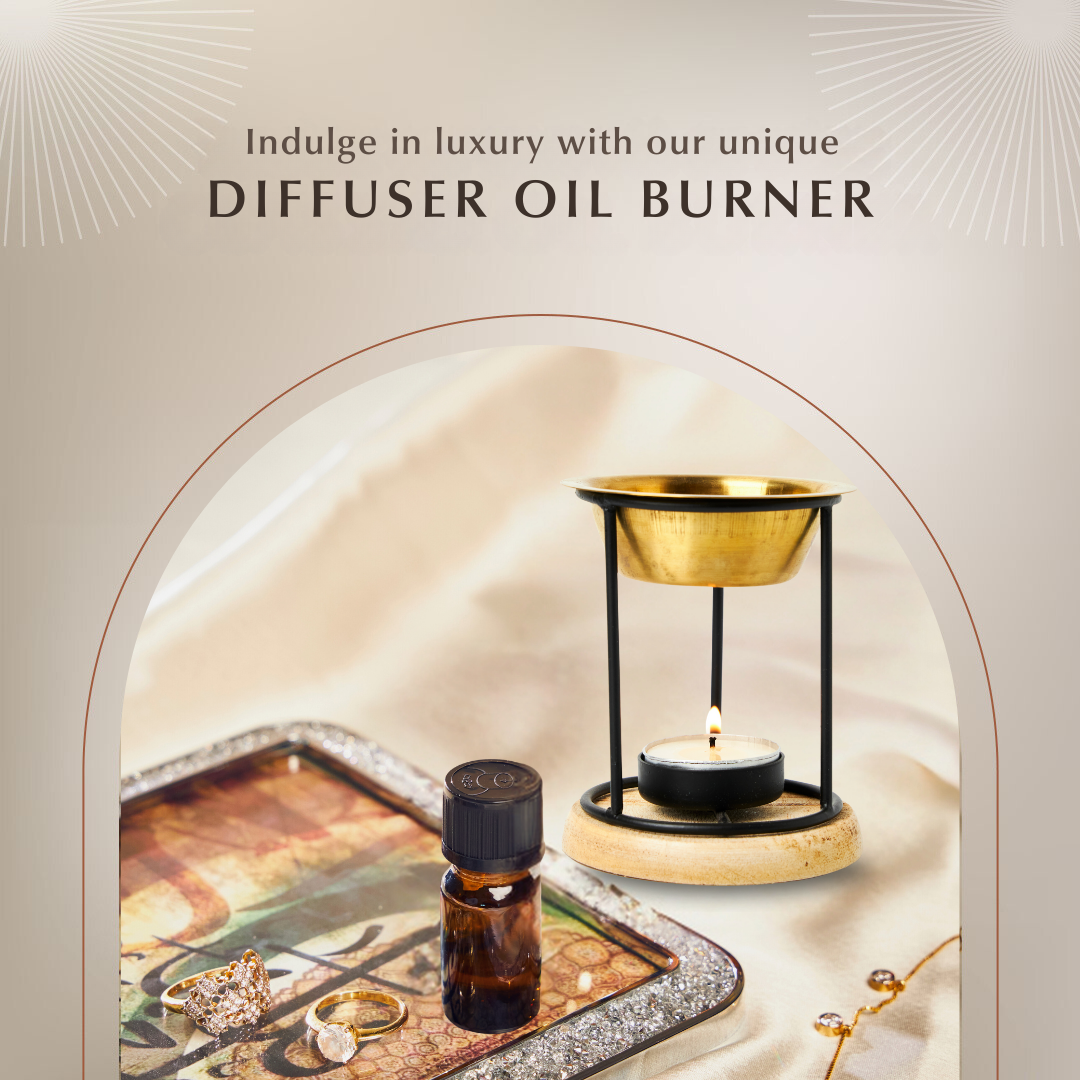 How to use: Put the black metal burner on the wooden coaster and place the brass bowl above. Add 8-10 drops of the oud oil to water in the bowl. Light a tea light candle and place it below the brass bowl. You can add more oil to your diffuser for a stronger scent or if burning in a very large area
