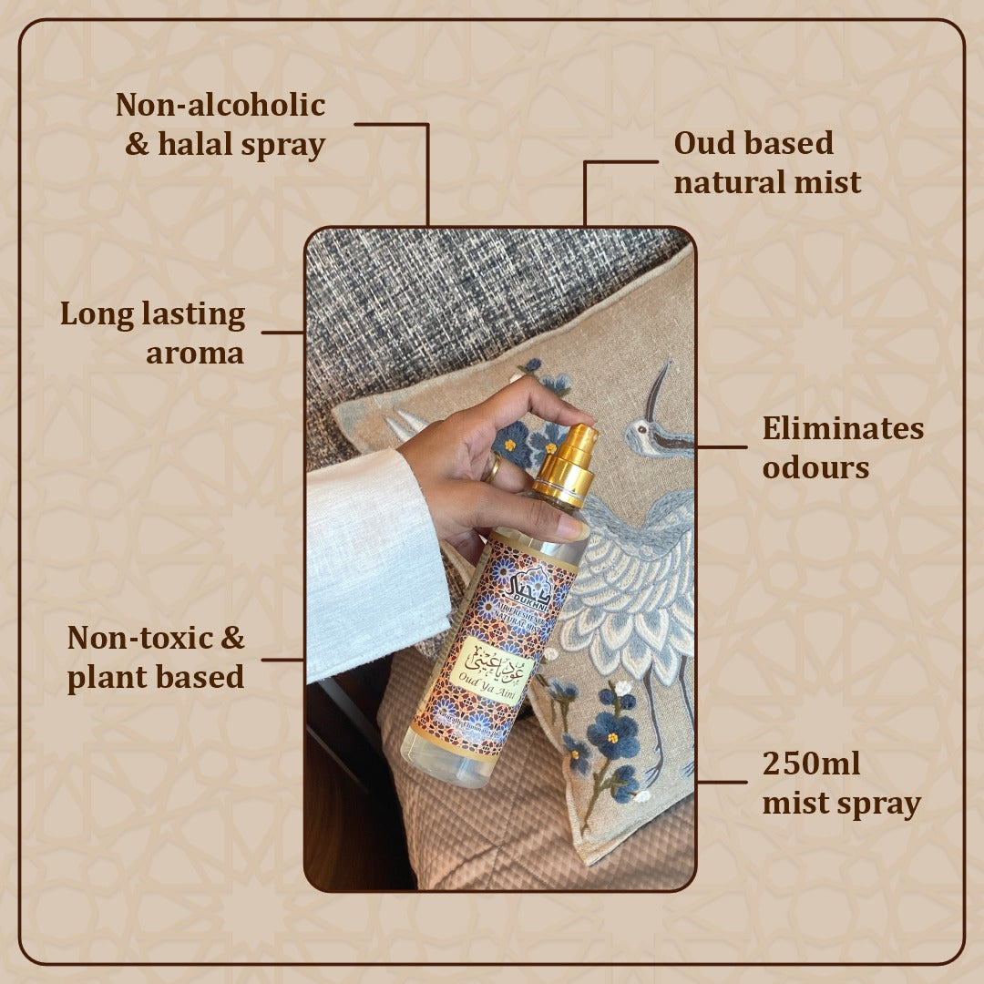 Scent profile: Oud Ya Aini natural mist is a non-alcoholic fabric and room spray with a sophisticated oriental feel. With warming top notes of saffron and nutmeg leading to an earthy twist of nut grass and ylang ylang and a sultry base of amber and agarwood, this is a heady scent with zest and depth.