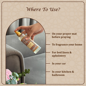 Transform your space Dukhni mists are ideal for refreshing fabrics, prayer mats, furniture, and more. Versatile as air fresheners, car sprays, or for revitalizing your kitchen and bathroom, they're perfect for any moment, be it pre-prayer, pre-guests, or post-cleaning.