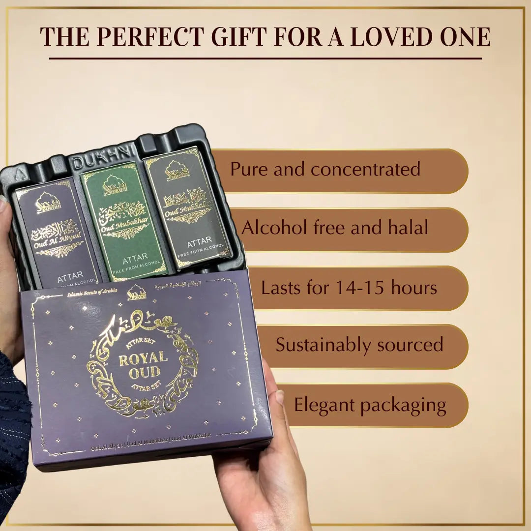 This Dukhni attar oil set is ideal for lovers of oud fragrances, offering a luxurious, non-alcoholic experience for both men and women, with captivating earthy and woody notes