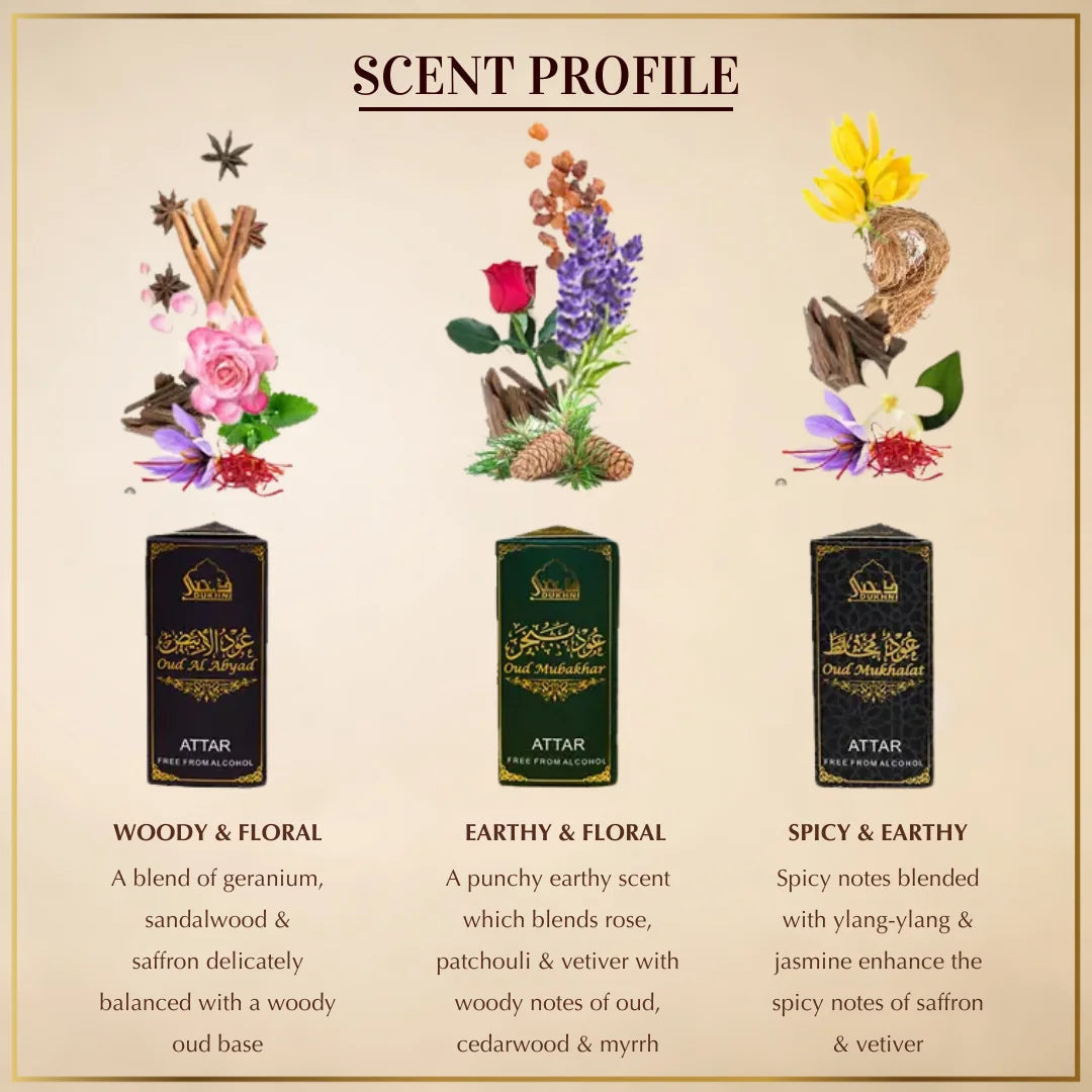3 Bottles x 6ml Attar Oils – Oud Mukhalat, Oud Mubakhar, Oud Al Abyad (White Oud) (0.2 fl oz each)