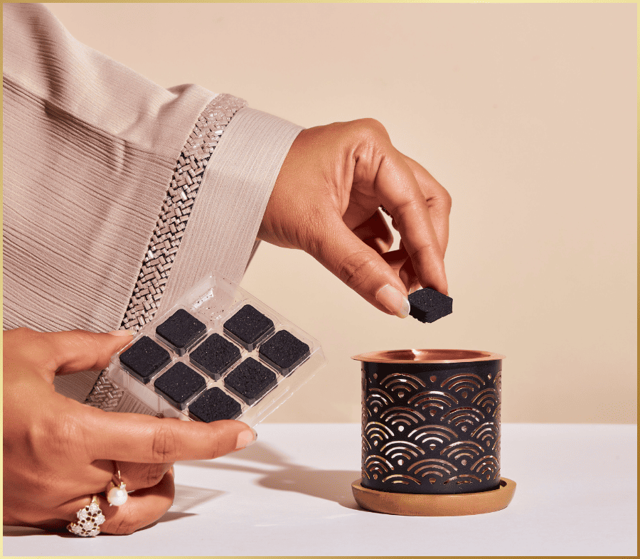 The art of making بخور (Bakhoor) begins with selecting the finest raw materials - fragrant woods, precious resins, and aromatic spices. These are ground and blended, then infused with natural oils and essences. The mixture is shaped into pieces and left to mature, allowing the aromas to fully develop.