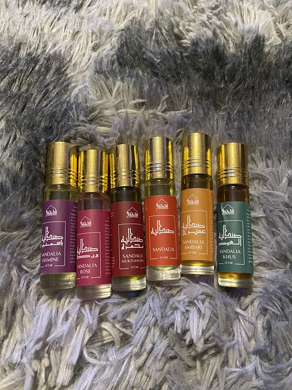 I received this Dukhni Attar Oil Set.A wonderful smell of perfume oils in the package.- Smell of Rose and Musk- Smell of Jasmine and Saffron- Smell of Leathery, Woody, and Earthy- Smell of Smoky, Sweet, and Woody- Smell of Spicy and warm aroma- Smell of Rose, Ylang-ylang, and White muskI never use it directly on my clothes because it can stains so I use it on my hands, neck, and back of my ears. These all smell amazing. Sometimes I use a couple of them for aromatherapy They offer excellent value for money. Overall, I like it.