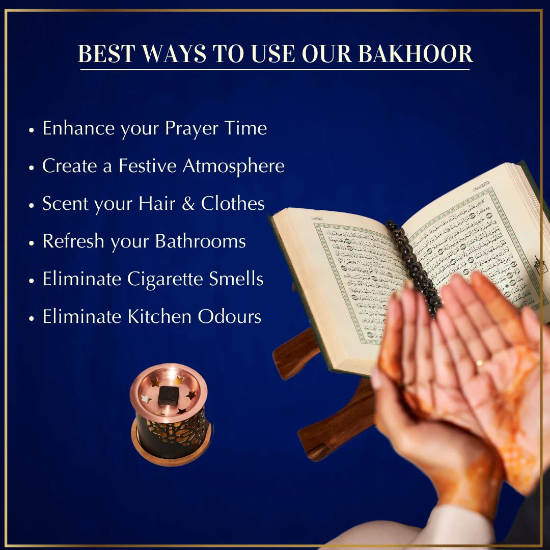 A rich discovery of traditional Arabian bakhoor aromas, ranging from sweet and floral notes to deep, smoky, and woody oud blends. As the bakhoor gently heats, it fills the space with warmth and depth, creating a calming, spiritually uplifting ambience ideal for prayer, Quran recitation, and meditation.