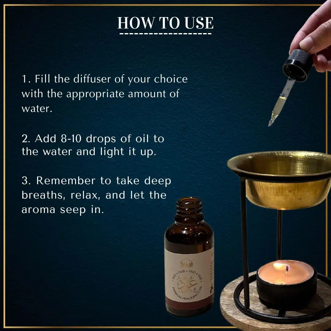 HOW TO USE: Add 7-8 drops of the oud oil to water and burn it using a candle based or electronic diffuser. You can add more oil to your diffuser for a stronger scent or if burning in a large area