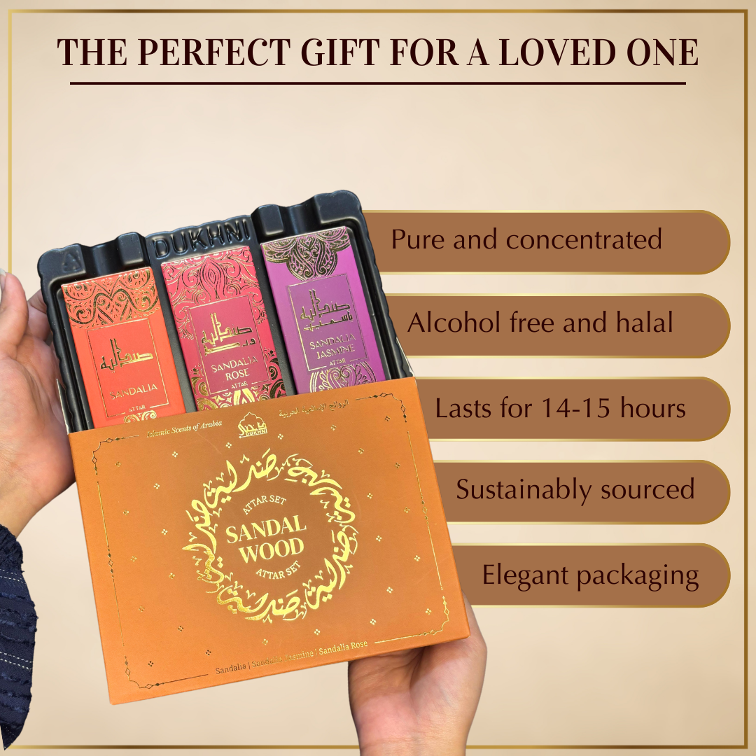Love sandalwood? Experience 3 unique attars infused with sandalwood's warm, woody essence. Enjoy long-lasting, luxurious roll on perfumes—perfect as a fragrance gift set, thoughtful gift ideas for men and women.