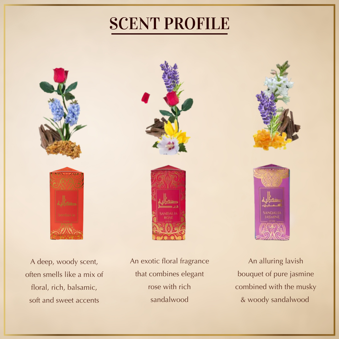 3 Bottles x 6ml Attar Oils – Sandalia, Sandalia Rose, Sandalia Jasmine (0.2 fl oz each)
